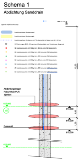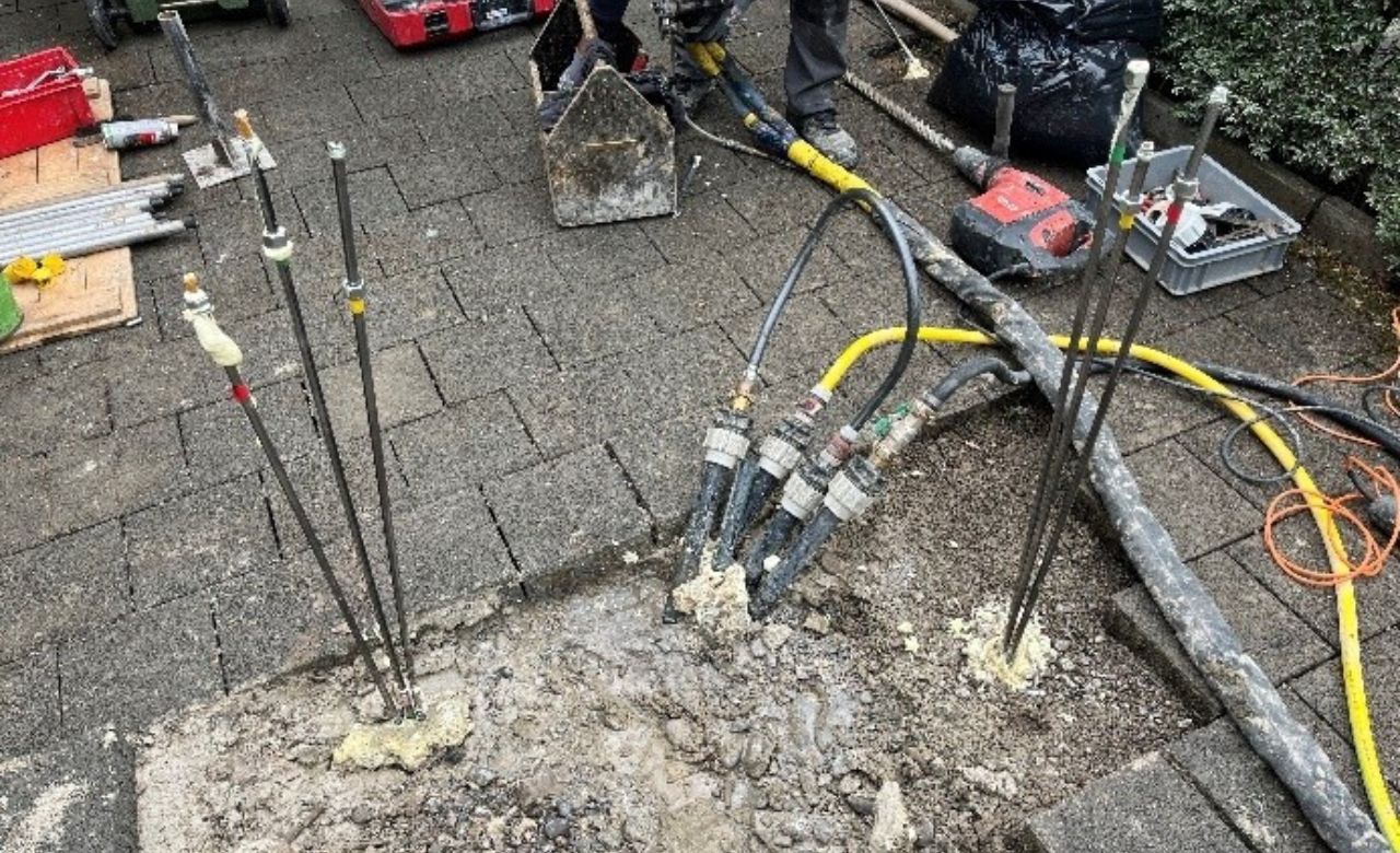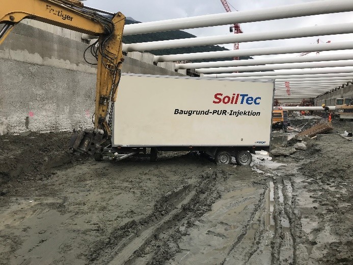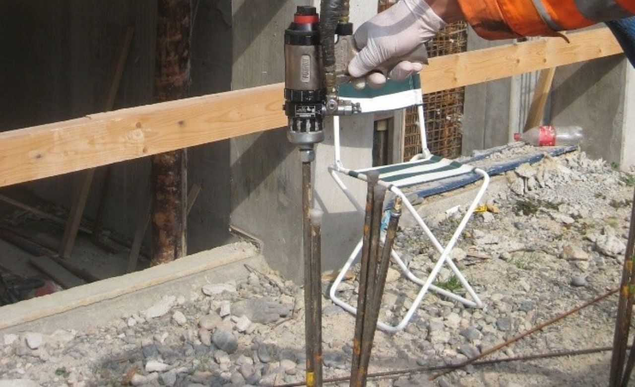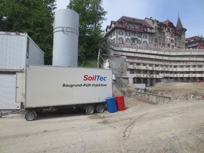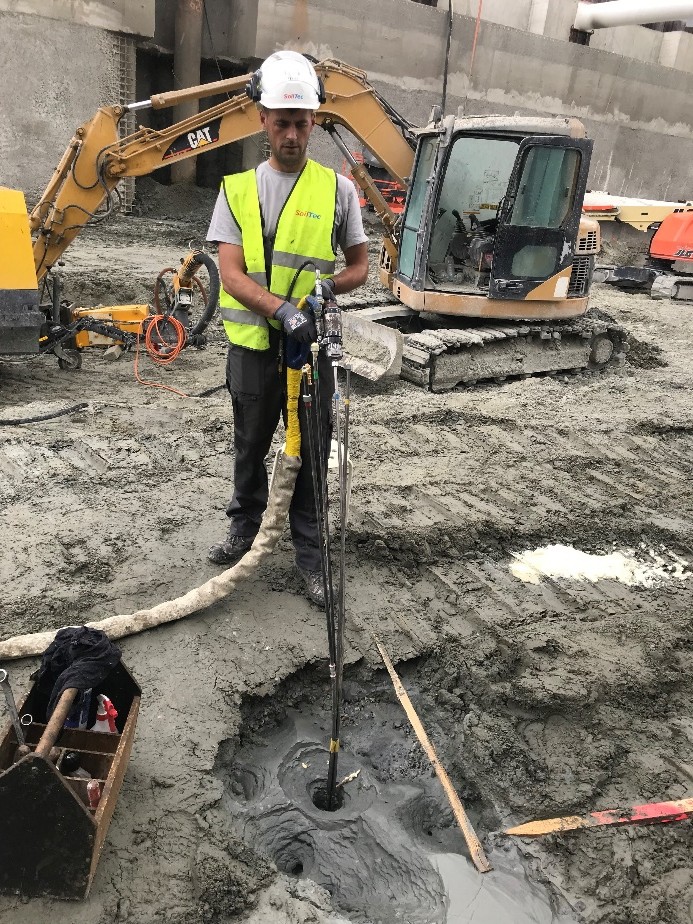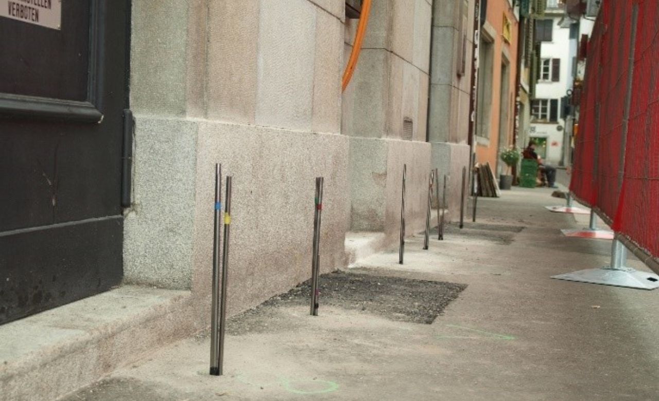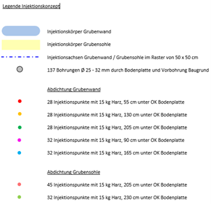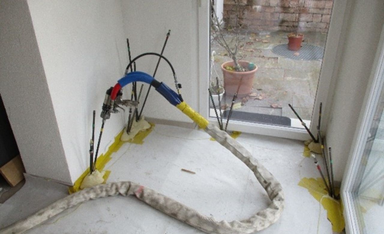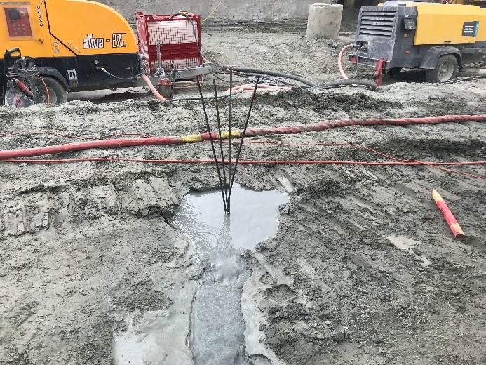 Die Injektionslanzen werden durch Vorbohrungen (Ø 32 mm) im Baugrund platziert. Nach Abschluss der Injektionsarbeiten bleiben die Lanzen auf Höhe OK Boden abgekappt im Baugrund und sind nicht nachinjizierbar.