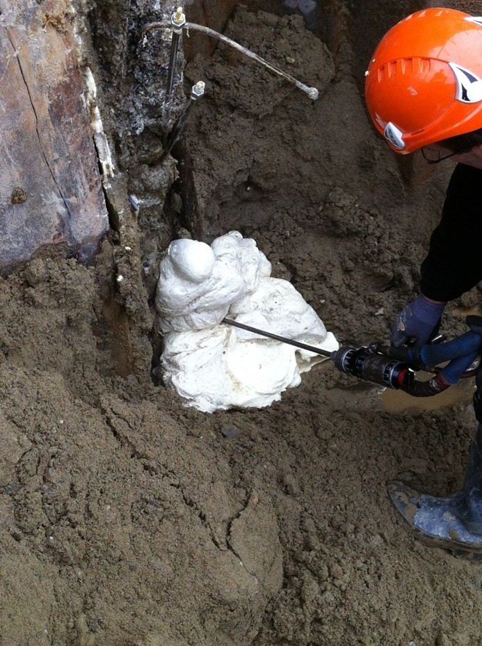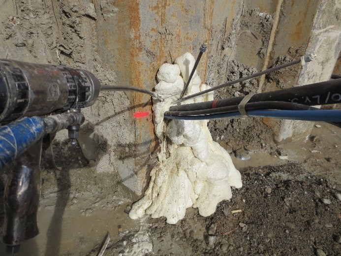 Bei der Baugrund-PUR-Injektion wird aufschäumendes Polyurethan über Injektionslanzen (Stahlrohre, Ø 12 mm) in einem festgelegten Raster und über mehrere Tiefenstufen in den zu behandelnden Baugrund injiziert.